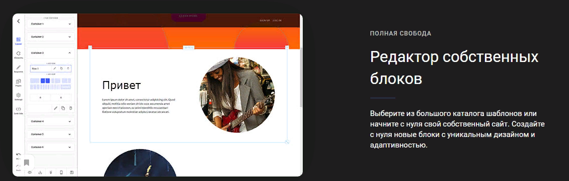 Выберите из большого каталога шаблонов или начните с нуля свой собственный сайт. Создайте с нуля новые блоки с уникальным дизайном и адаптивностью.